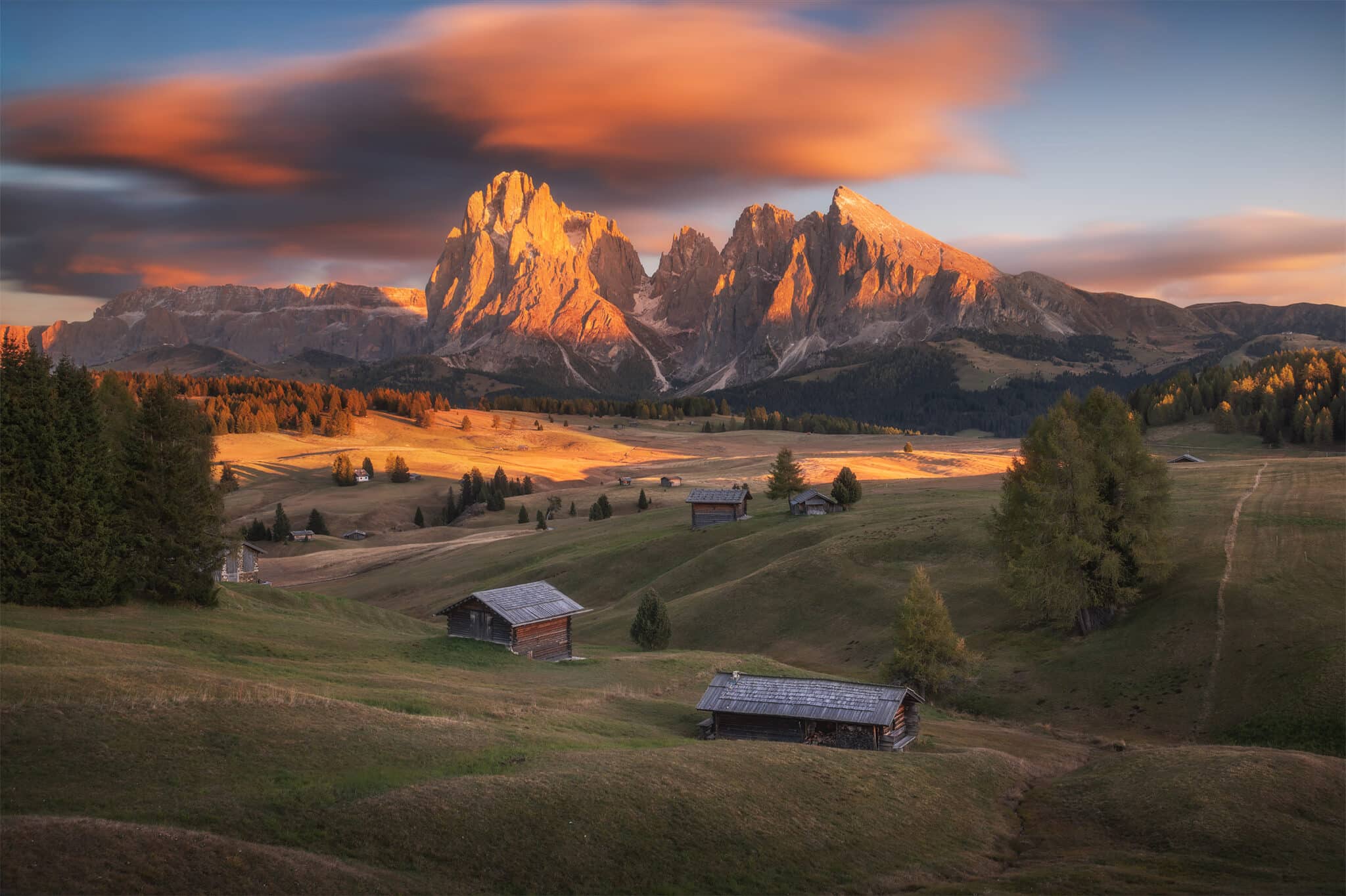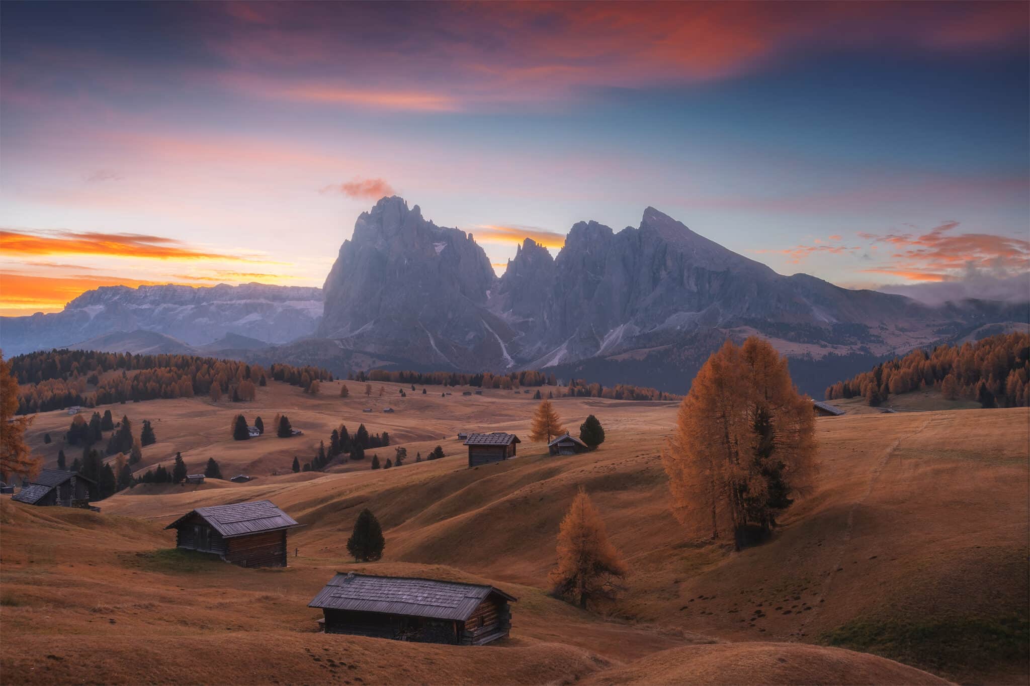 Time to see the reason (at least, one of the main ones) why we traveled in this area of the Dolomites: the incredibly beautiful Alpe di Siusi, with its typical wooden cabins scattered all over the high altitude plateau (the highest in Europe!) and the rugged Sassolungo and Sassopiatto in the background. This place is so special that we will actually visit it twice – given its beauty and the multitude of perspectives. In autumn you will get the sun peaking through the mountains at sunrise, creating one of the most incredible backlit scenes that you’ll ever see!
