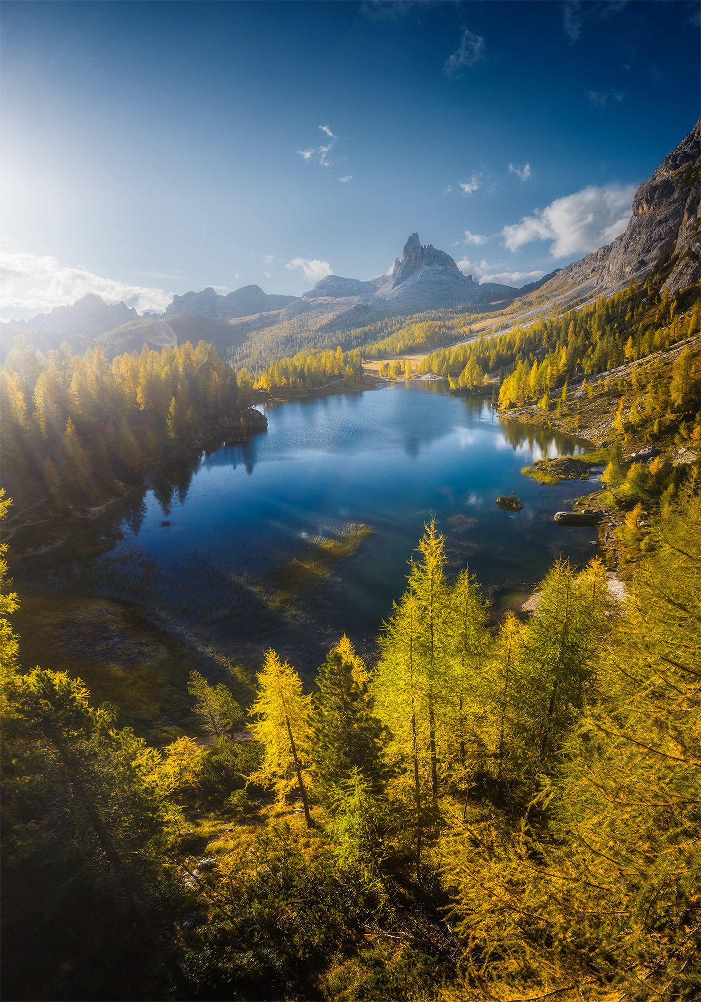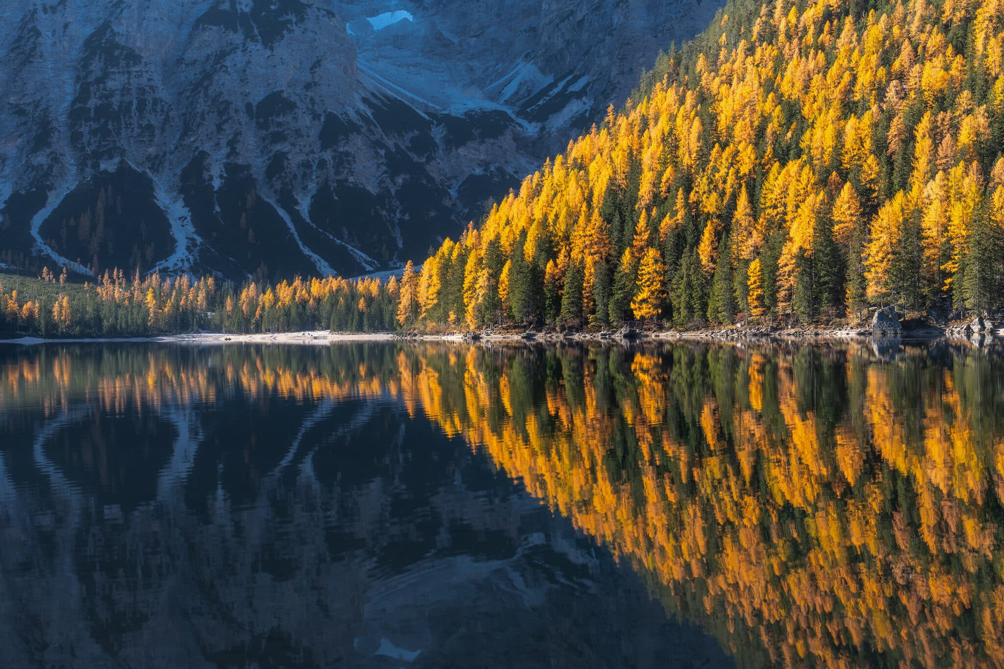 The location we will be visiting this morning is an “autumn special”: one of the places that we only visit during this season, and there’s a very special reason why. This lake, called Federal Lake, is surrounded by larch trees, which are the most common trees in the area and the ones that become golden at this time of the year: getting the reflection on the Becco di Mezzodì (the mountain) with the fiery larches is one of the most amazing images you can capture in the Dolomites during autumn!
