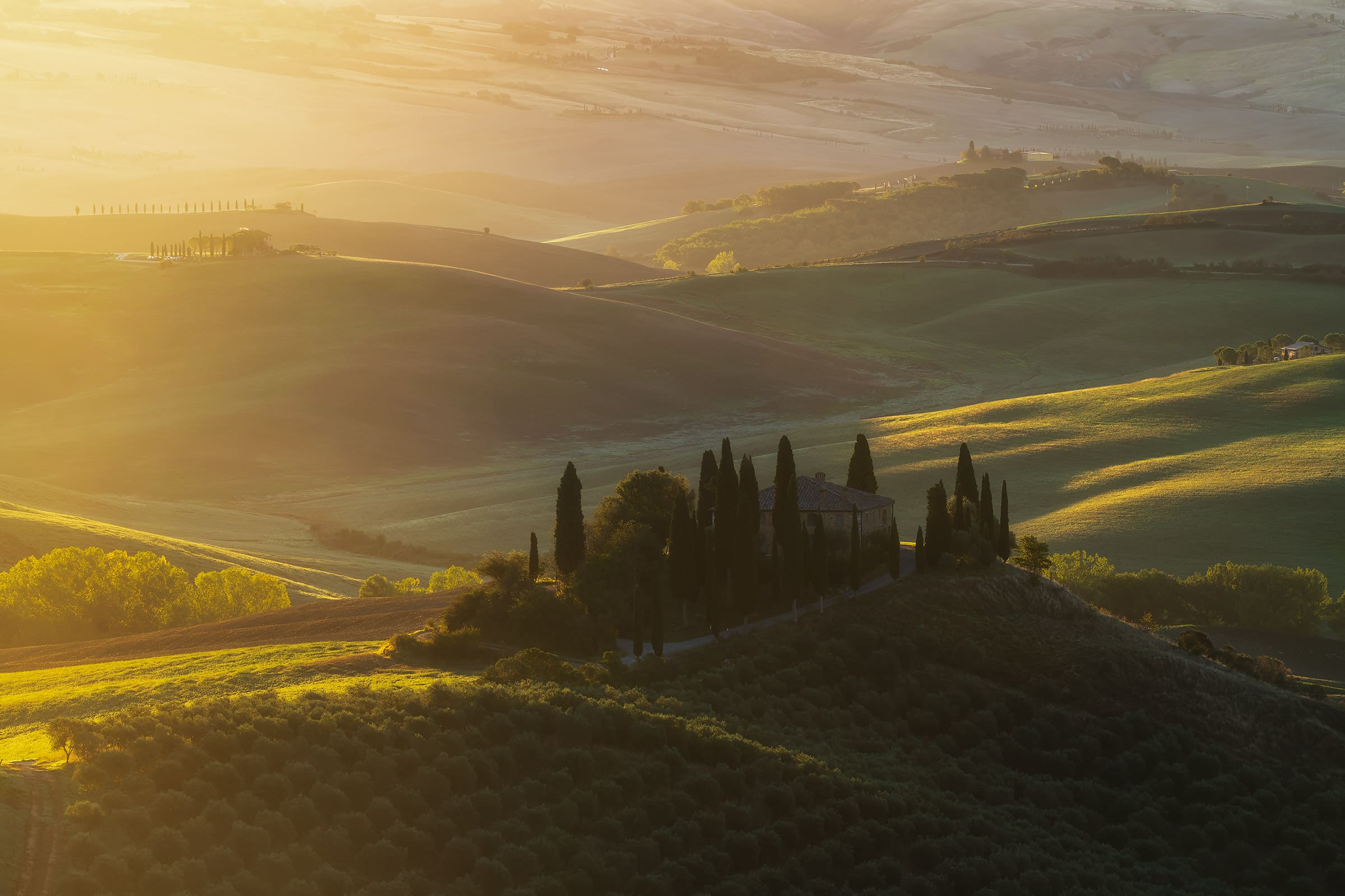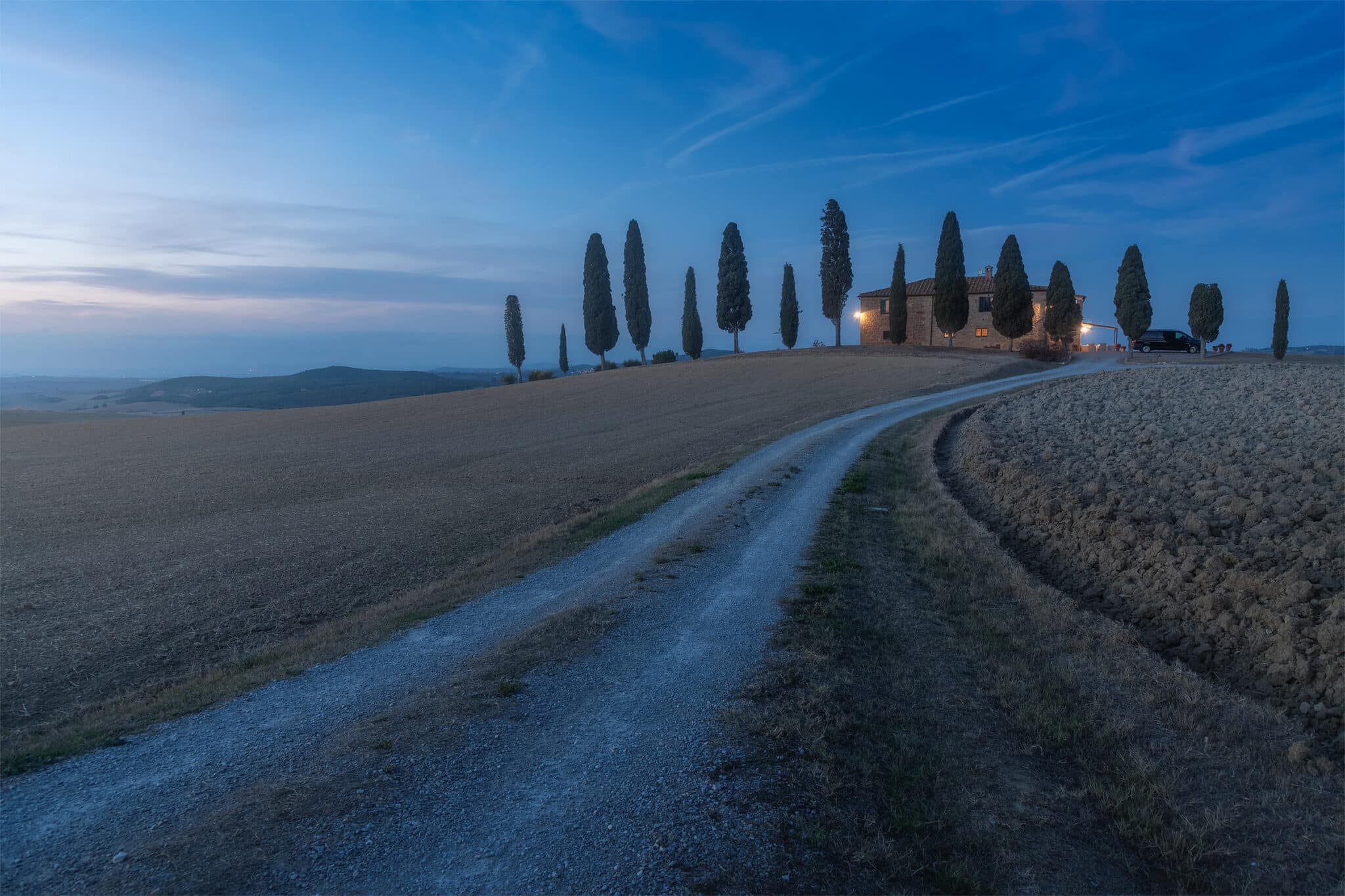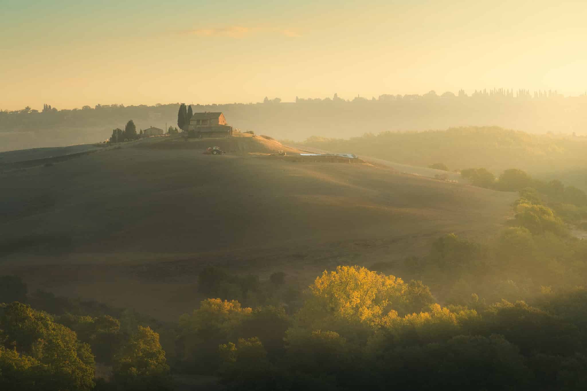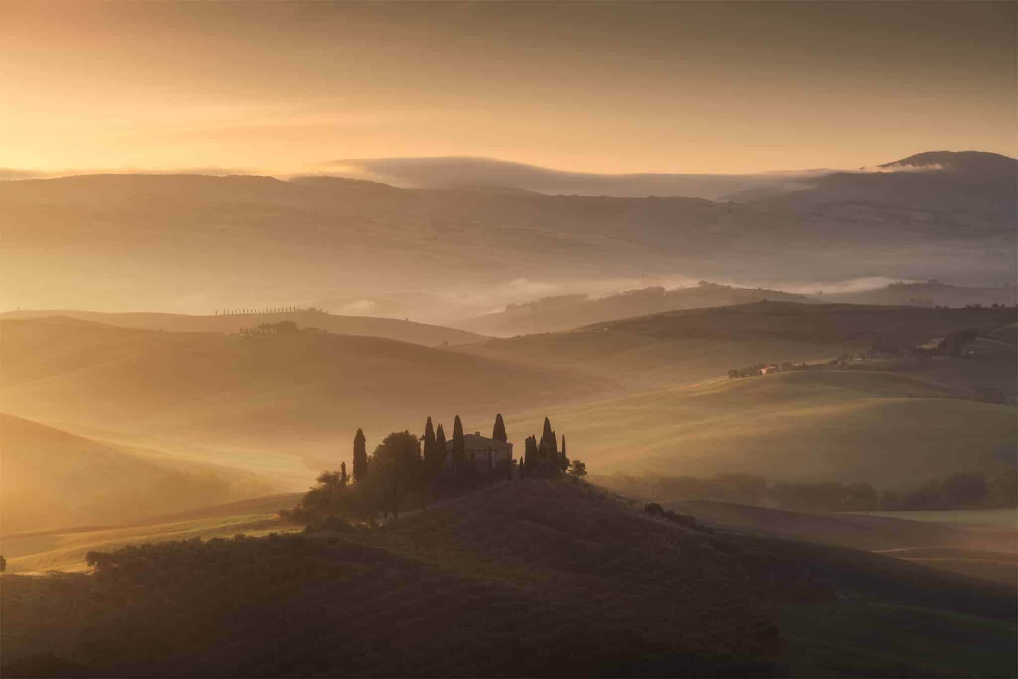 An early wake up call waits for us: we will go out when the twilight glow is just starting to appear, so that by the blue hour we will already be set up and ready to shoot! During our first sunrise session we’ll visit the iconic “Podere Belvedere”, one of the places that better represents the landscape of Tuscany: a country house, endless rolling hills and cypress trees all over the scene.