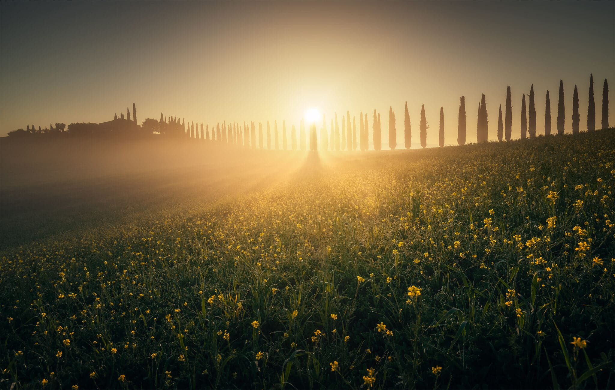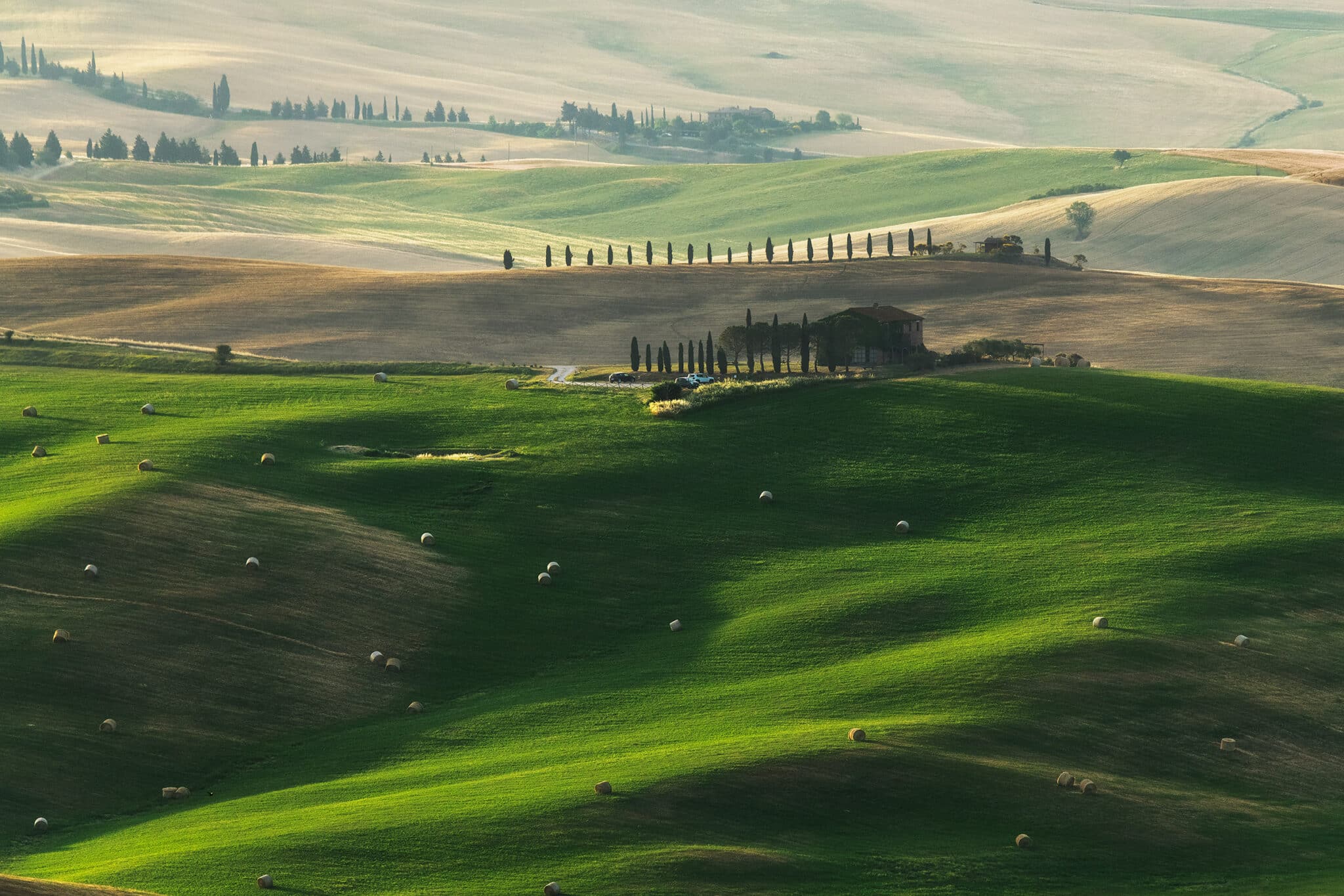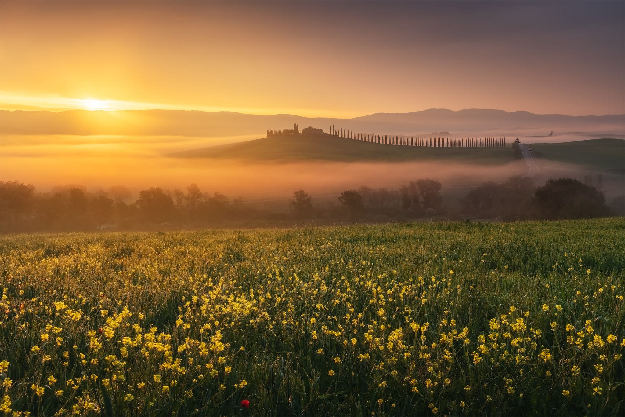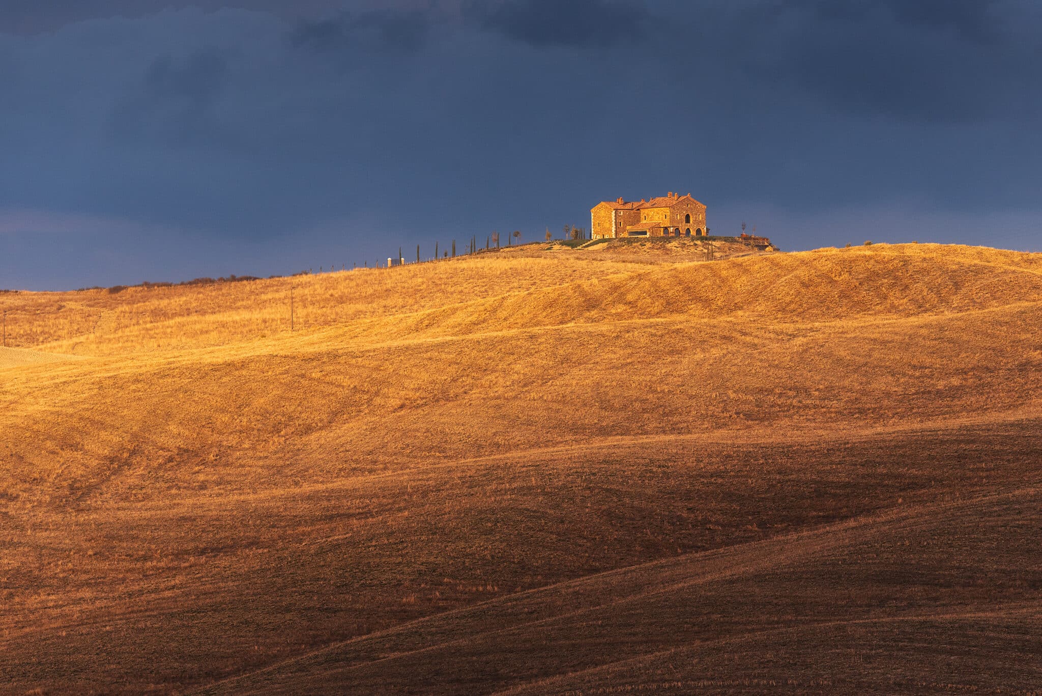 An early wake up call waits for us: we will go out when the twilight glow is just starting to appear, so that by the blue hour we will already be set up and ready to shoot! During our first sunrise session we’ll visit the iconic “Podere Belvedere”, one of the places that better represents the landscape of Tuscany: a country house, endless rolling hills and cypress trees all over the scene.