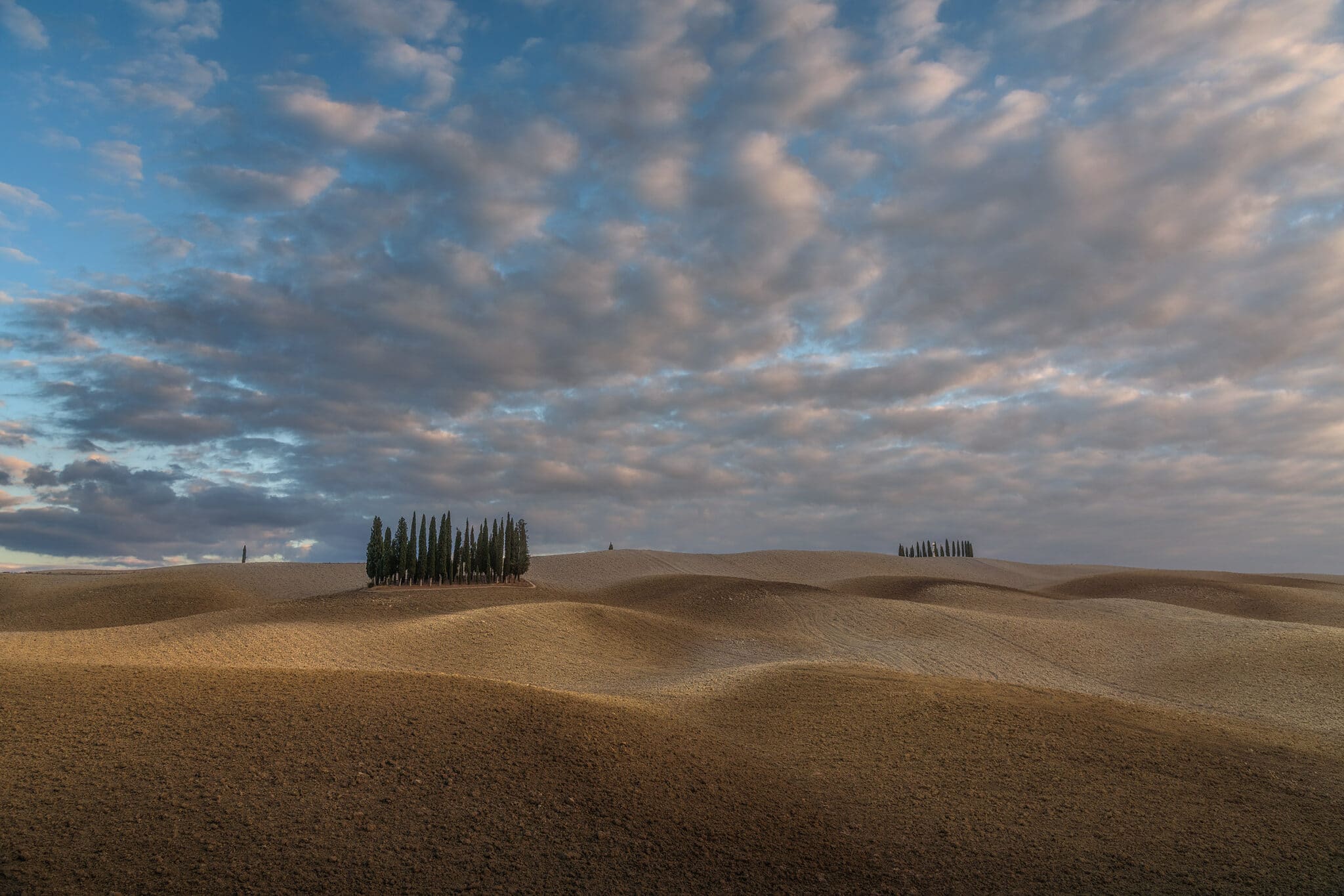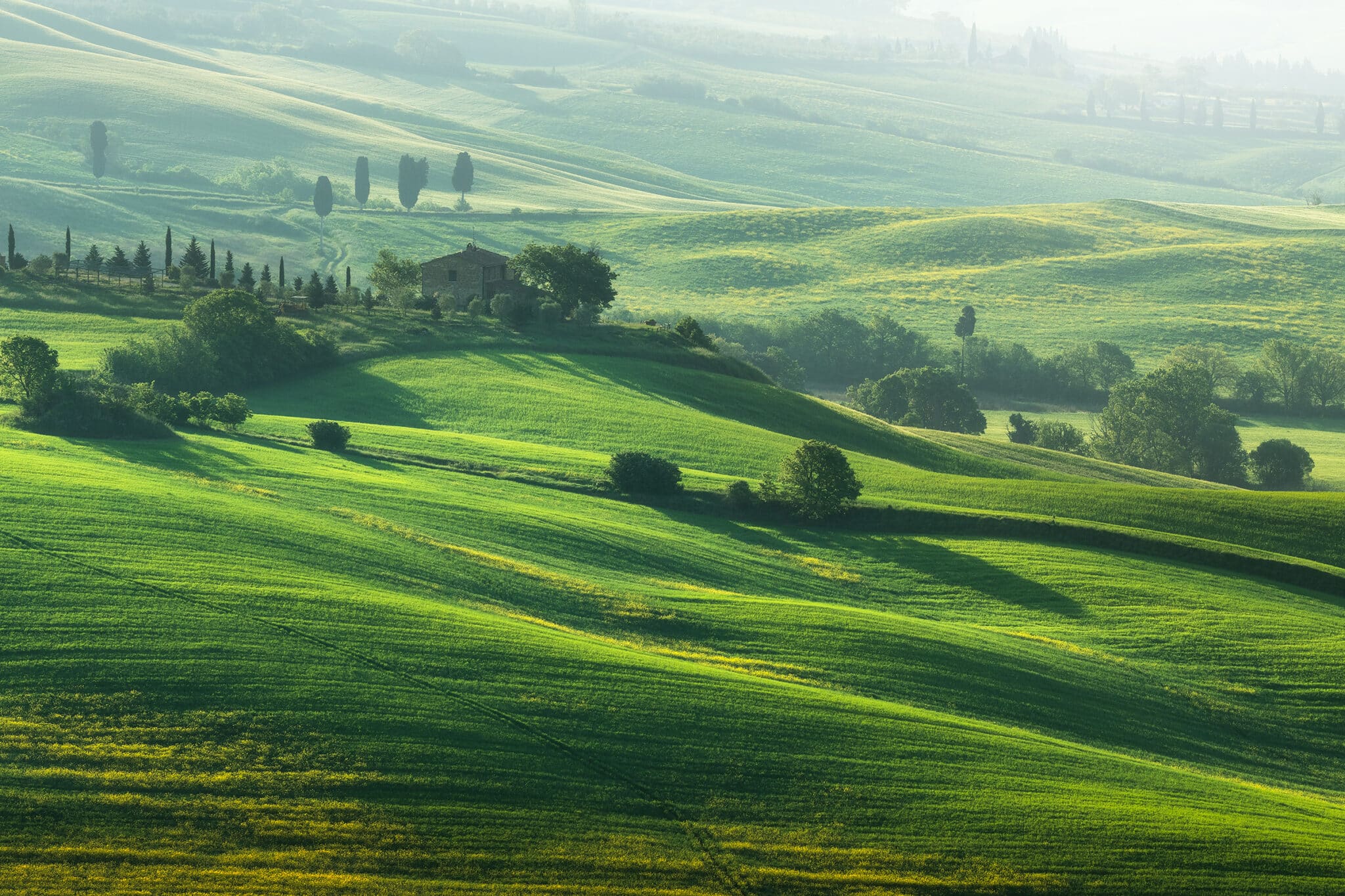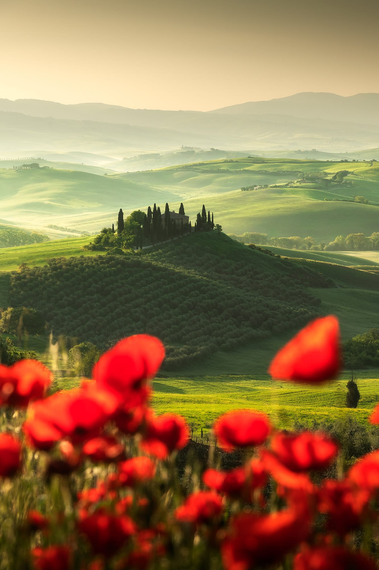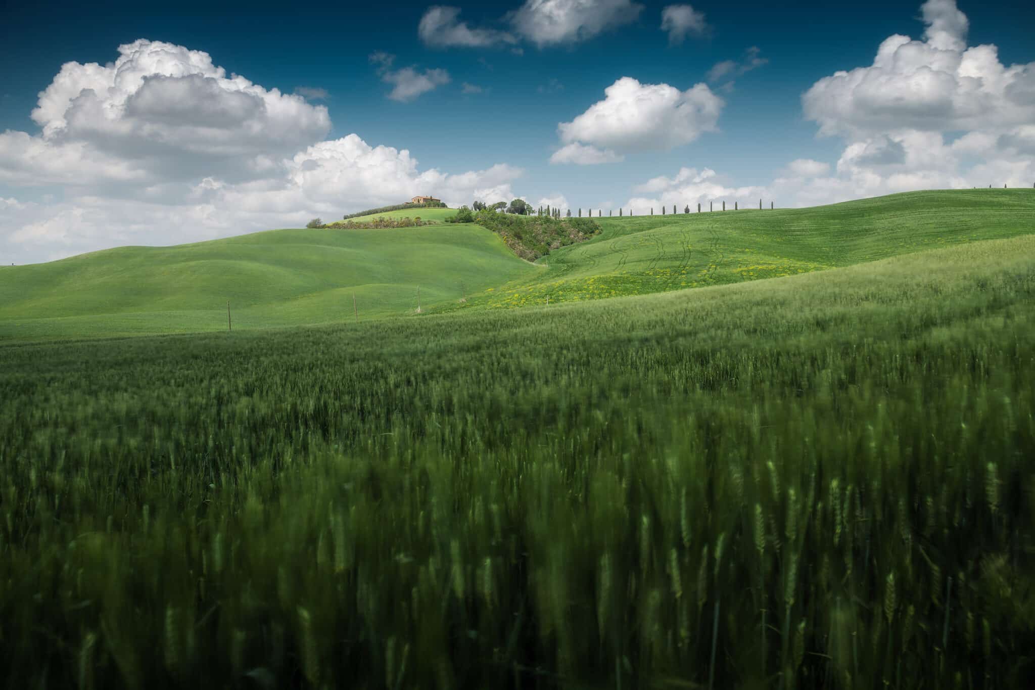 An early wake up call waits for us: we will go out when the twilight glow is just starting to appear, so that by the blue hour we will already be set up and ready to shoot! During our first sunrise session we’ll visit the iconic “Podere Belvedere”, one of the places that better represents the landscape of Tuscany: a country house, endless rolling hills and cypress trees all over the scene.