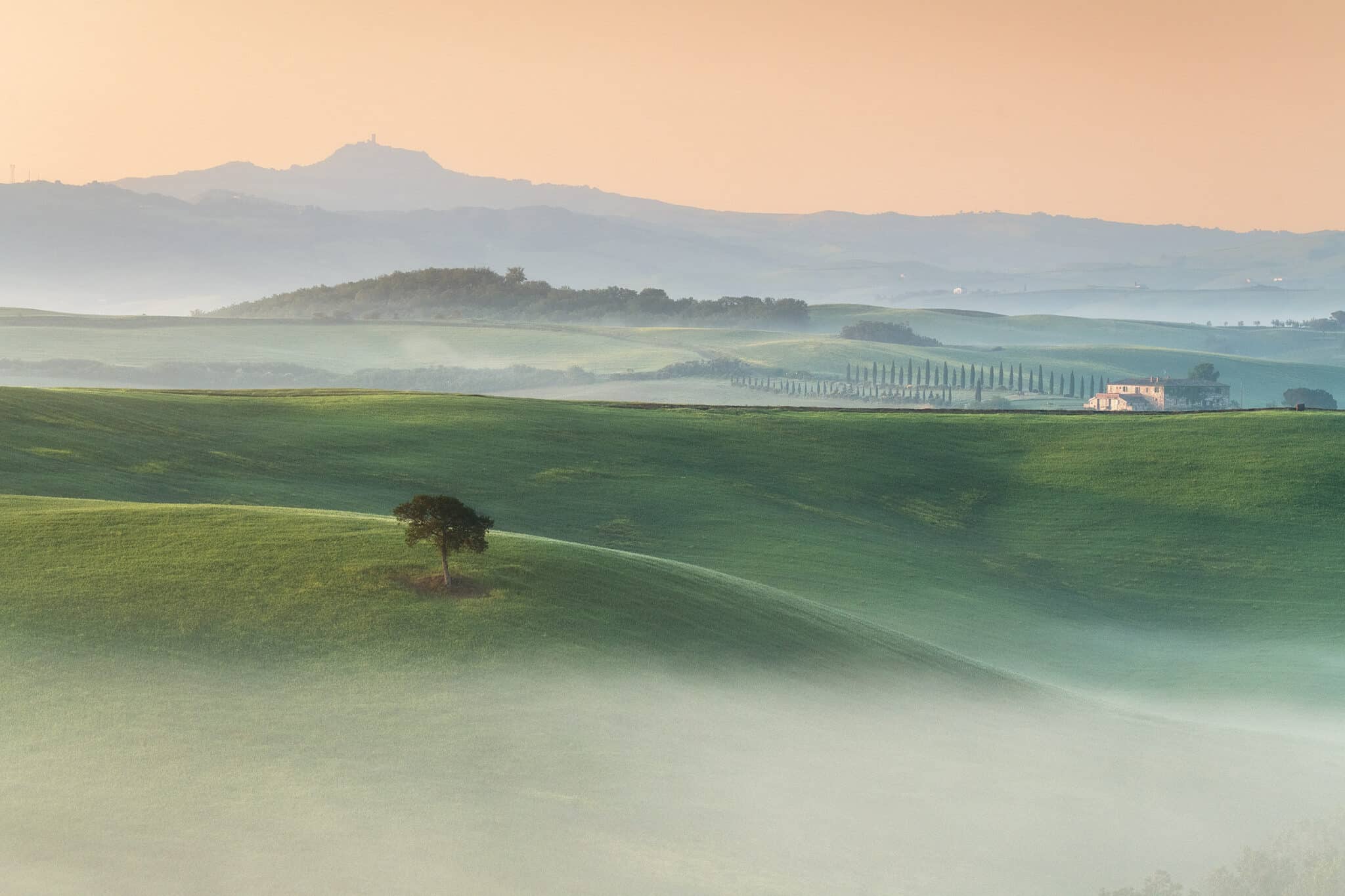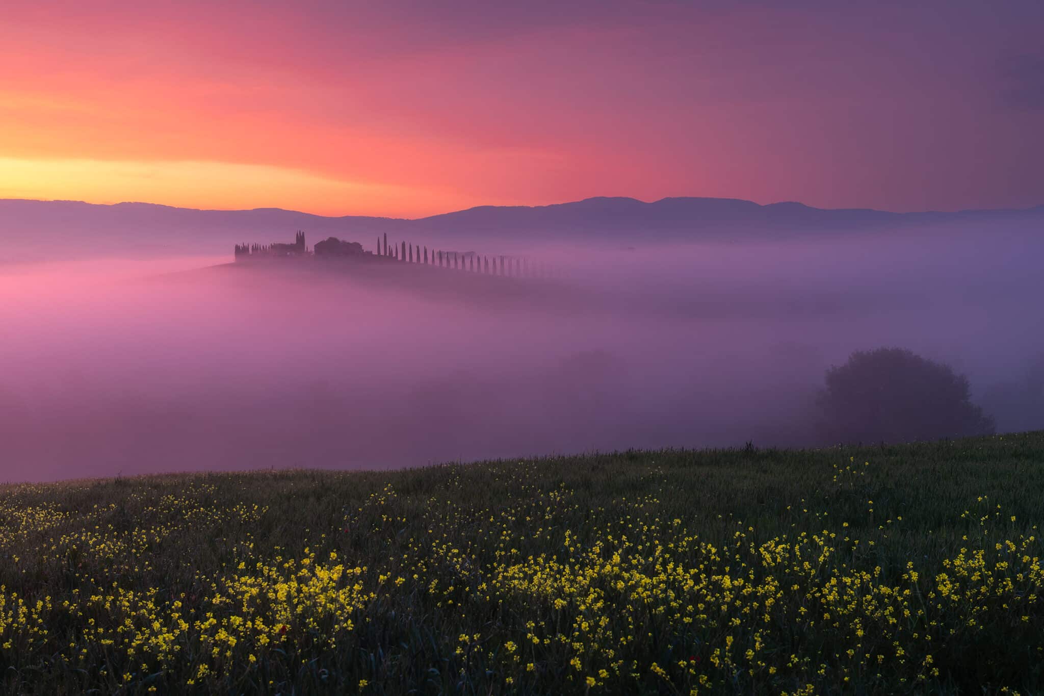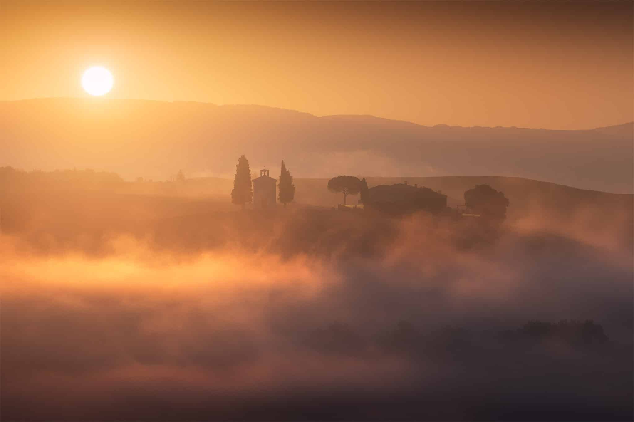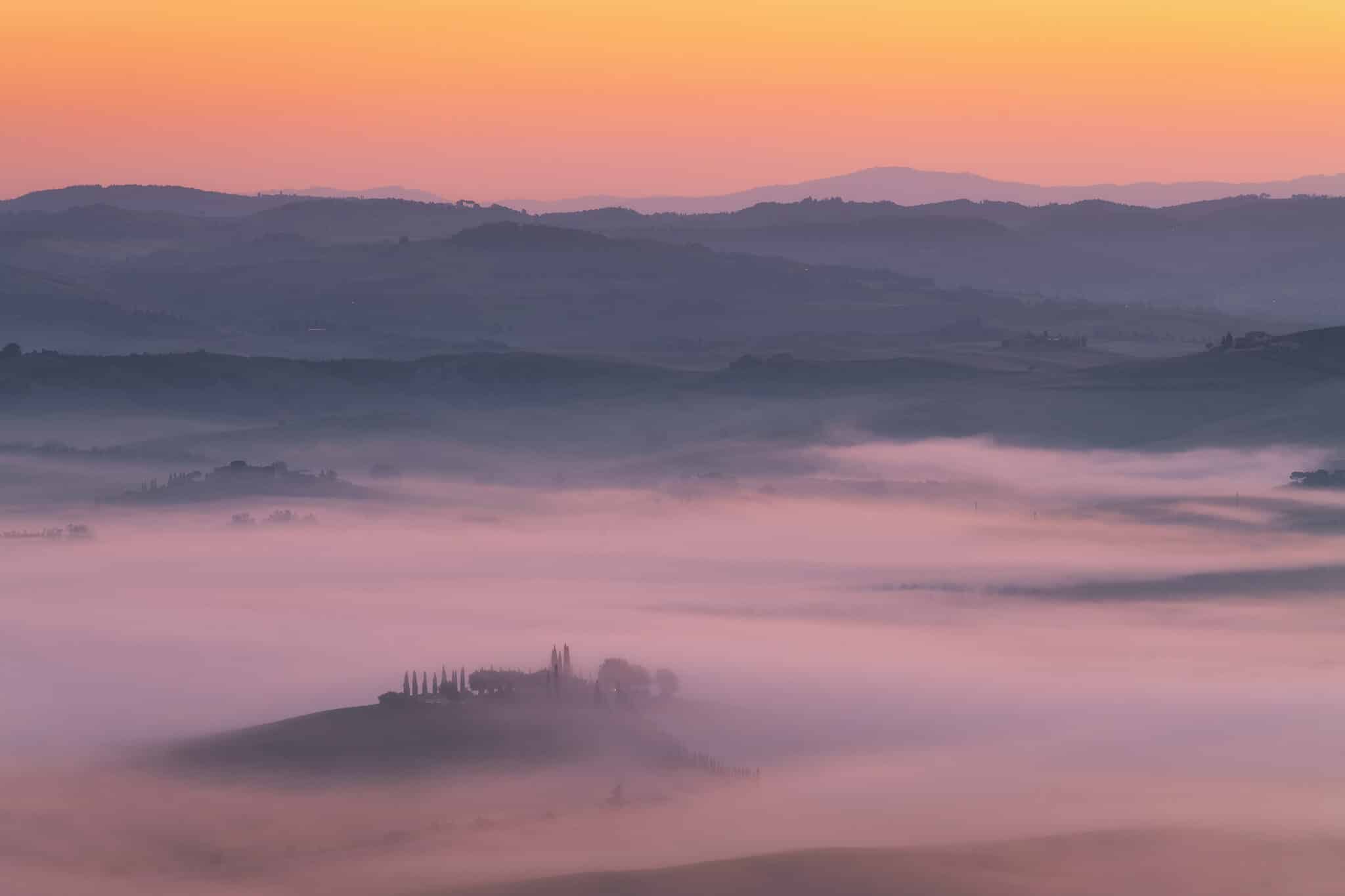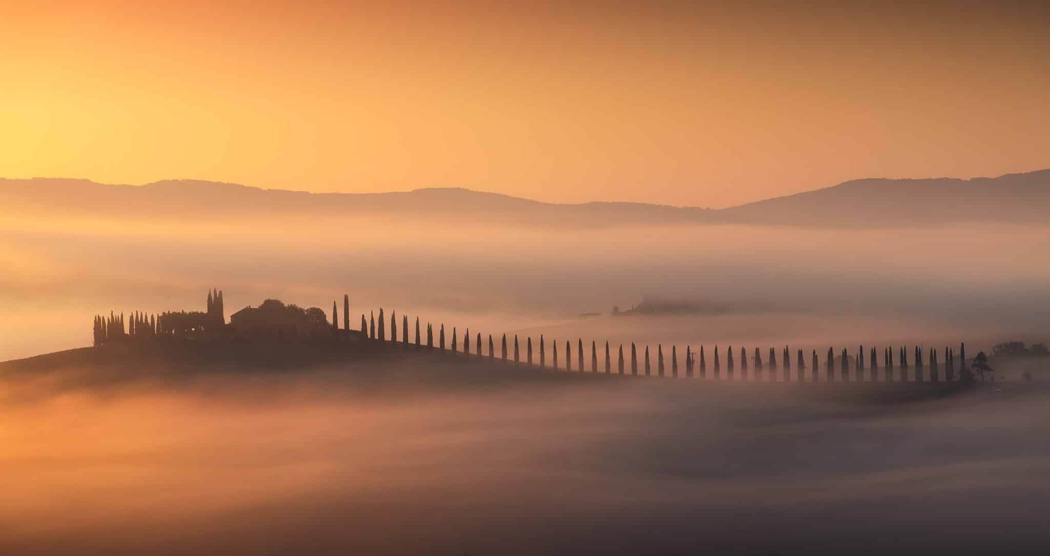 Another day, another early wake up call! During our second sunrise session we’ll visit Poggio Covili, a lovely house on top of a hill with its characteristic straight cypress trees road: getting the low fog here with just the house peaking out is every photographer’s dream when visiting Tuscany.