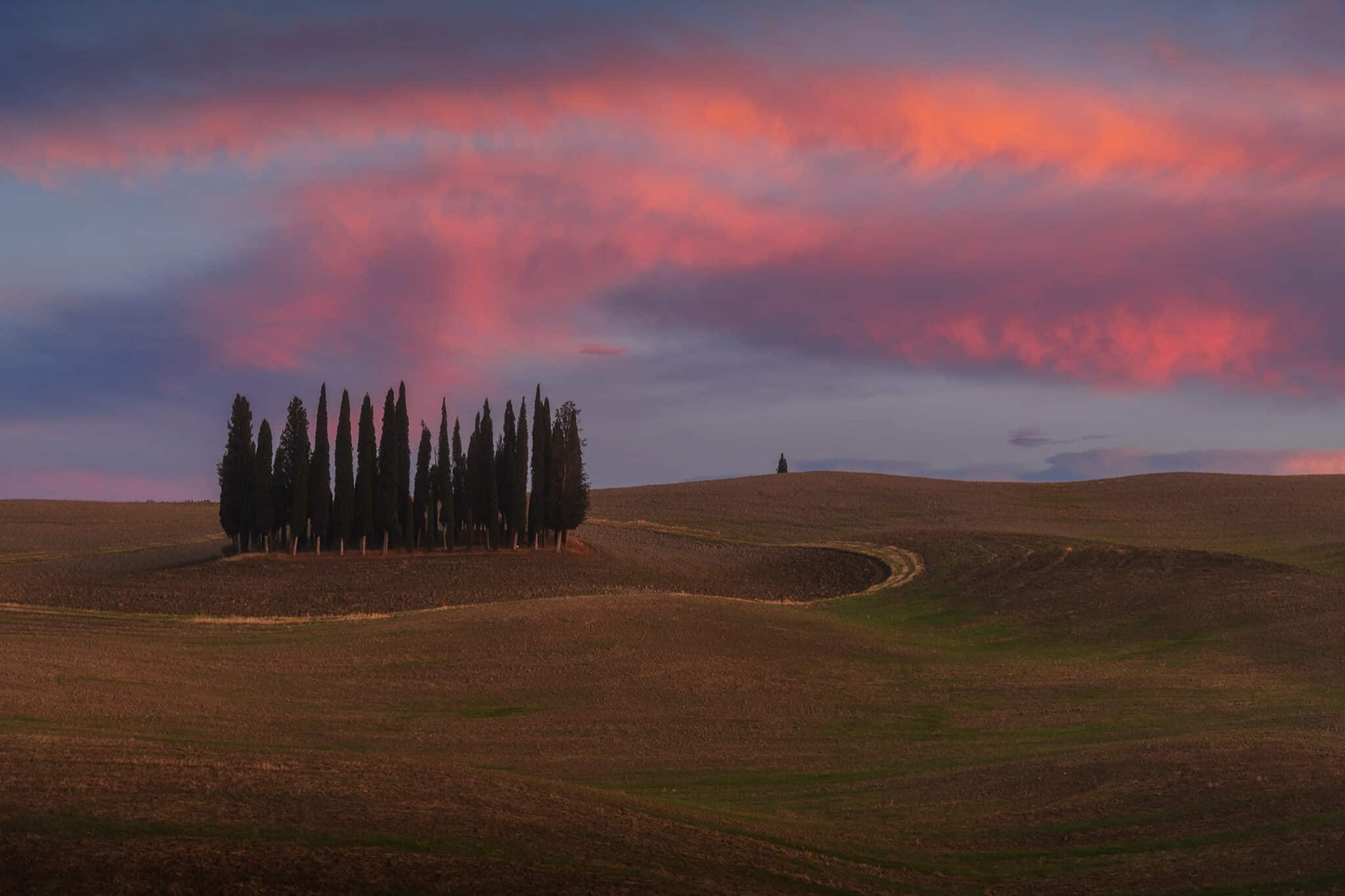 Another day, another sunset: at this “round” we will visit the infamous Podere Baccoleno, another popular house lost in the countryside a bit north from Pienza. This is actually one of the very few locations that it’s not in the Val d’Orcia but in a different area called Crete Senesi. That winding road is definitely an unmissable view of Tuscany!